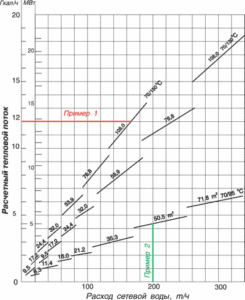 Требуемый размер подогревателя определяется заданным тепловым потоком или расходом нагреваемой сетевой воды и температурным режимом его работы. Выбор подогревателя рекомендуется производить по графику зависимости теплового потока от расхода нагреваемой сетевой воды при нагреве ее по температурным графикам теплосети 70/150°C, 70/130°C, 70/95°C.